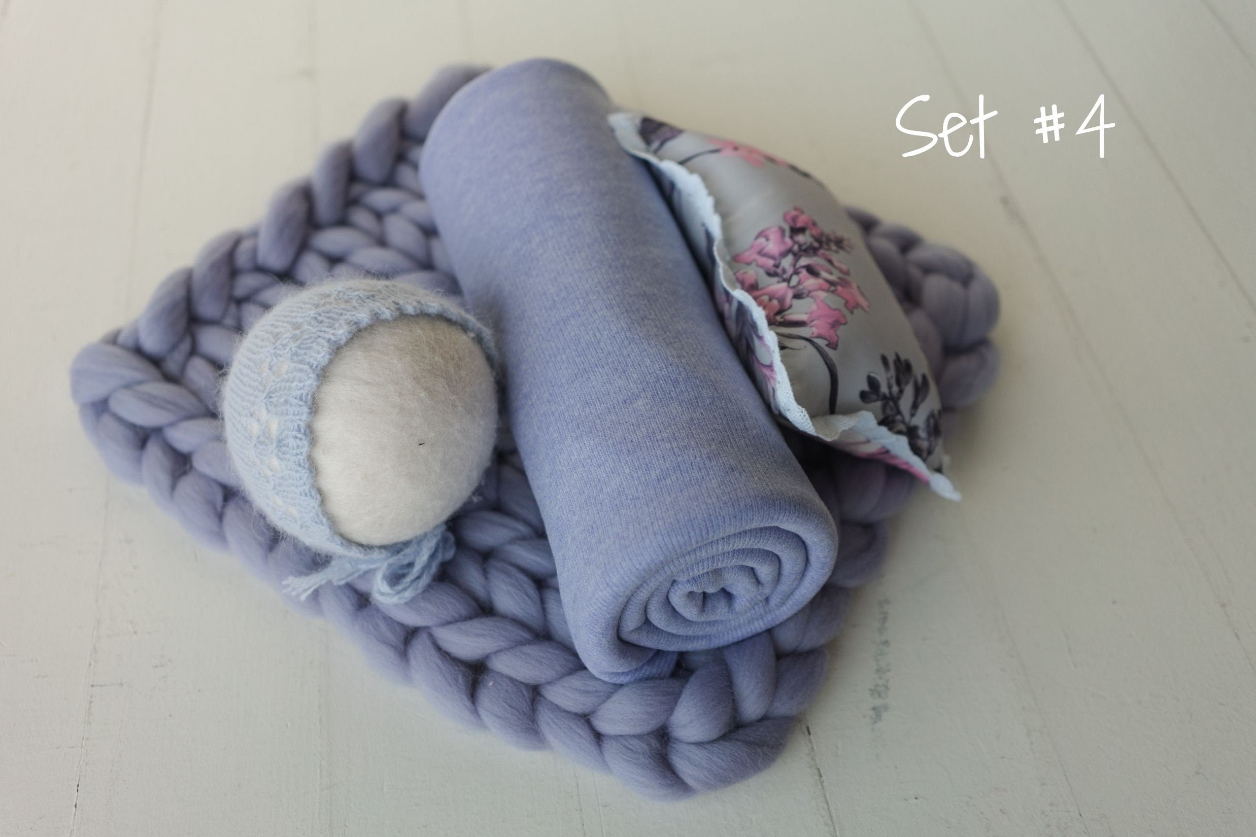 Choose Your Newborn Photo Prop Set Set #1: Merino wool blanket, newborn fabric backdrop, newborn photo pillow, newborn headband, and merino wool teddy bear. Set #2: Merino wool blanket, newborn fabric backdrop, newborn photo pillow, and newborn headband. Set #3: Merino wool blanket, newborn fabric backdrop, newborn photo pillow, newborn knitted bonnet, and newborn felted heart toy. Set #4: Merino wool blanket, newborn fabric backdrop, newborn photo pillow, and newborn knitted bonnet. Set #5: Merino wool blanket, newborn fabric backdrop, and newborn photo pillow. Set #6: Merino wool blanket and newborn fabric backdrop.