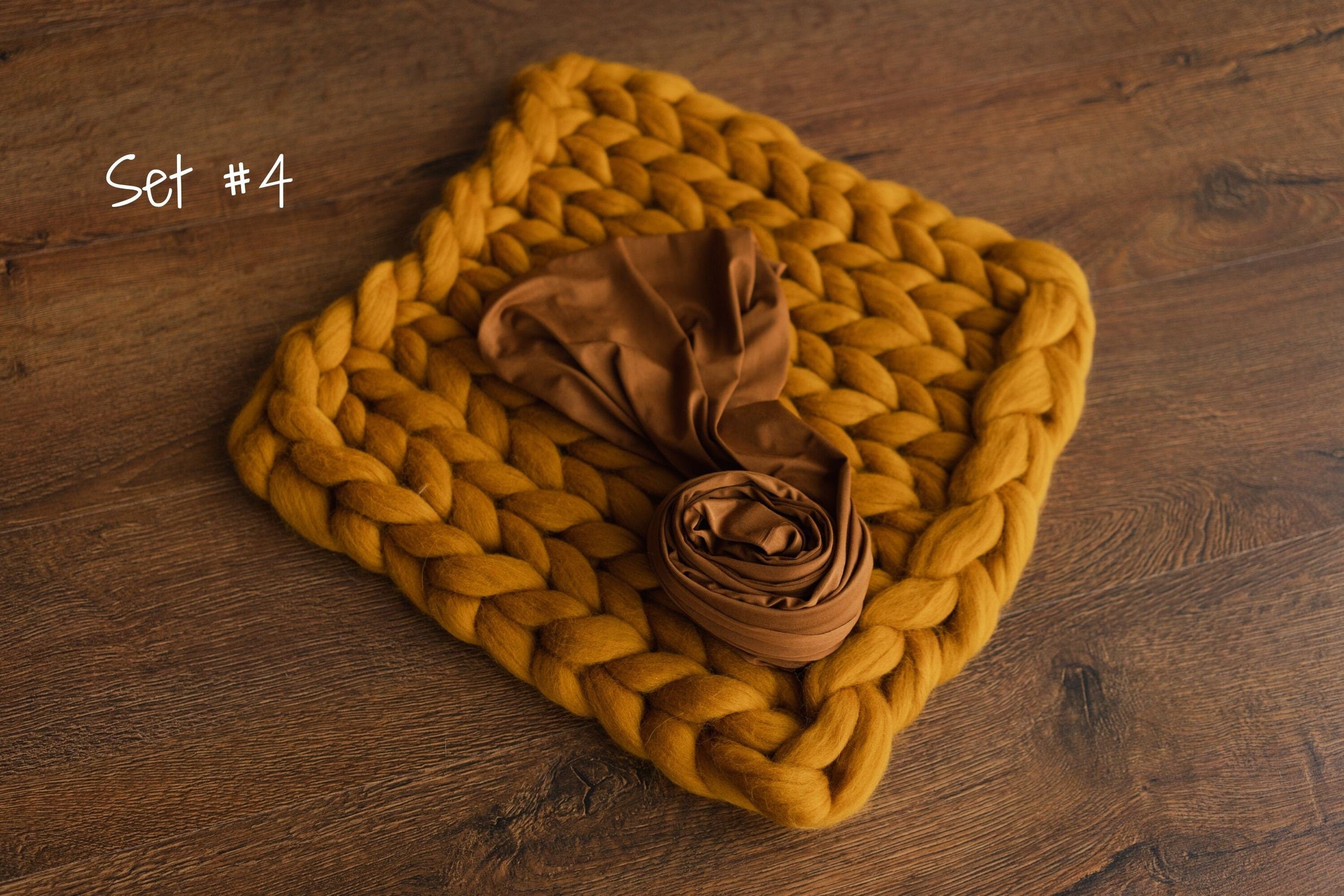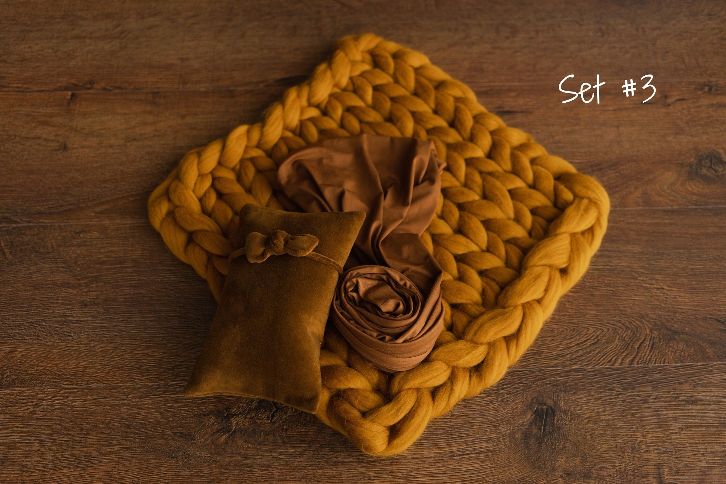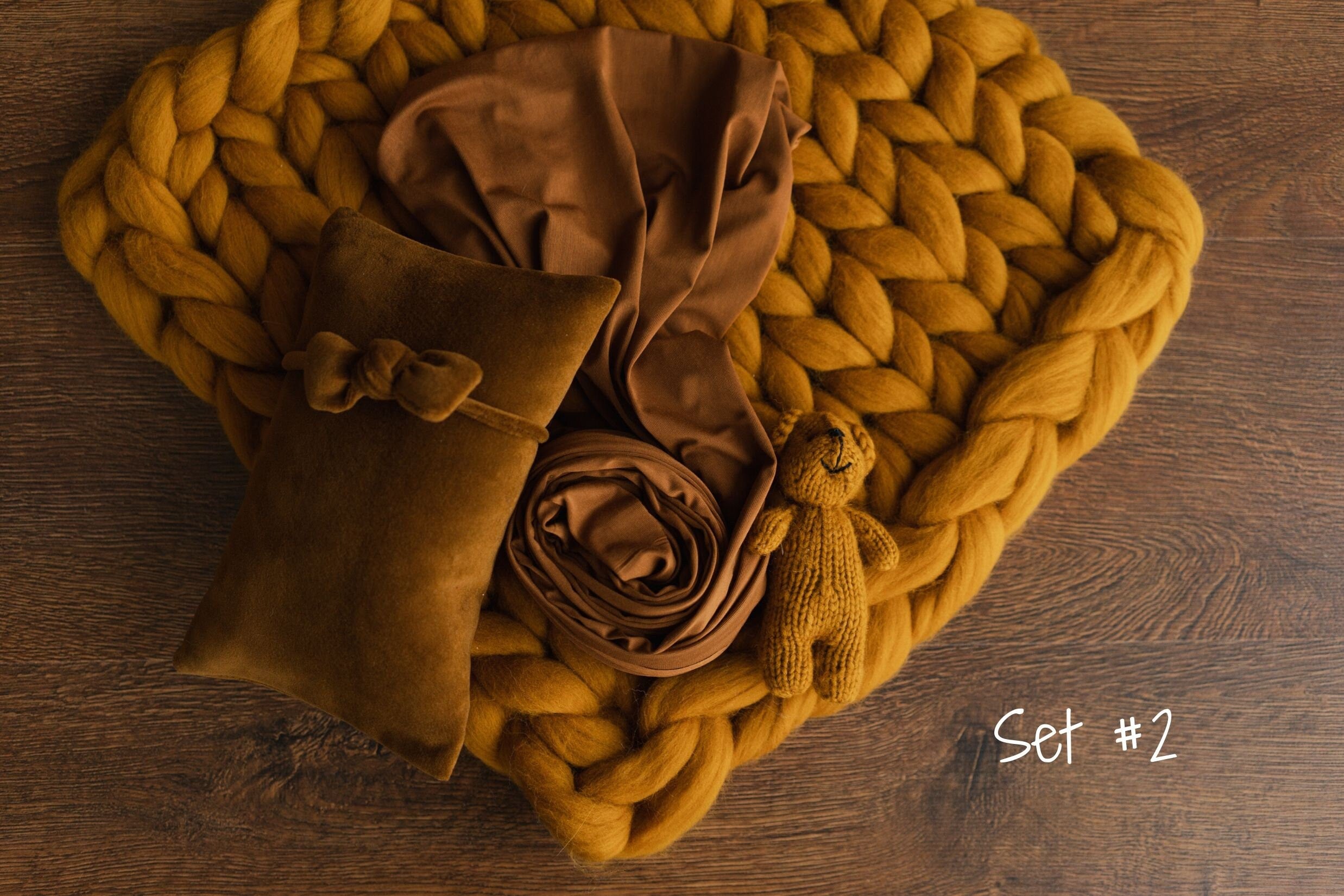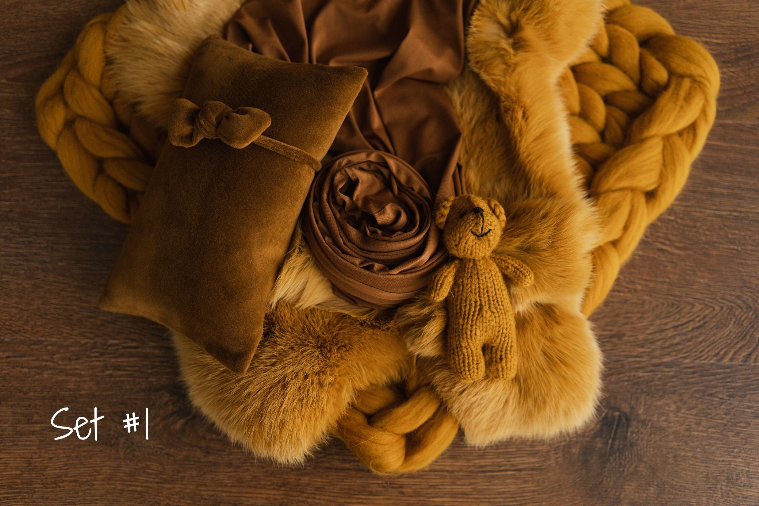 Choose Your Newborn Photo Prop Set Set #1: Merino wool blanket, newborn wrap, velvet pillow & headband set, merino wool bear toy, and natural rabbit fur. Set #2: Merino wool blanket, newborn wrap, velvet pillow & headband set, and merino wool bear toy. Set #3: Merino wool blanket, newborn wrap, and velvet pillow & headband set. Set #4: Merino wool blanket and newborn wrap.