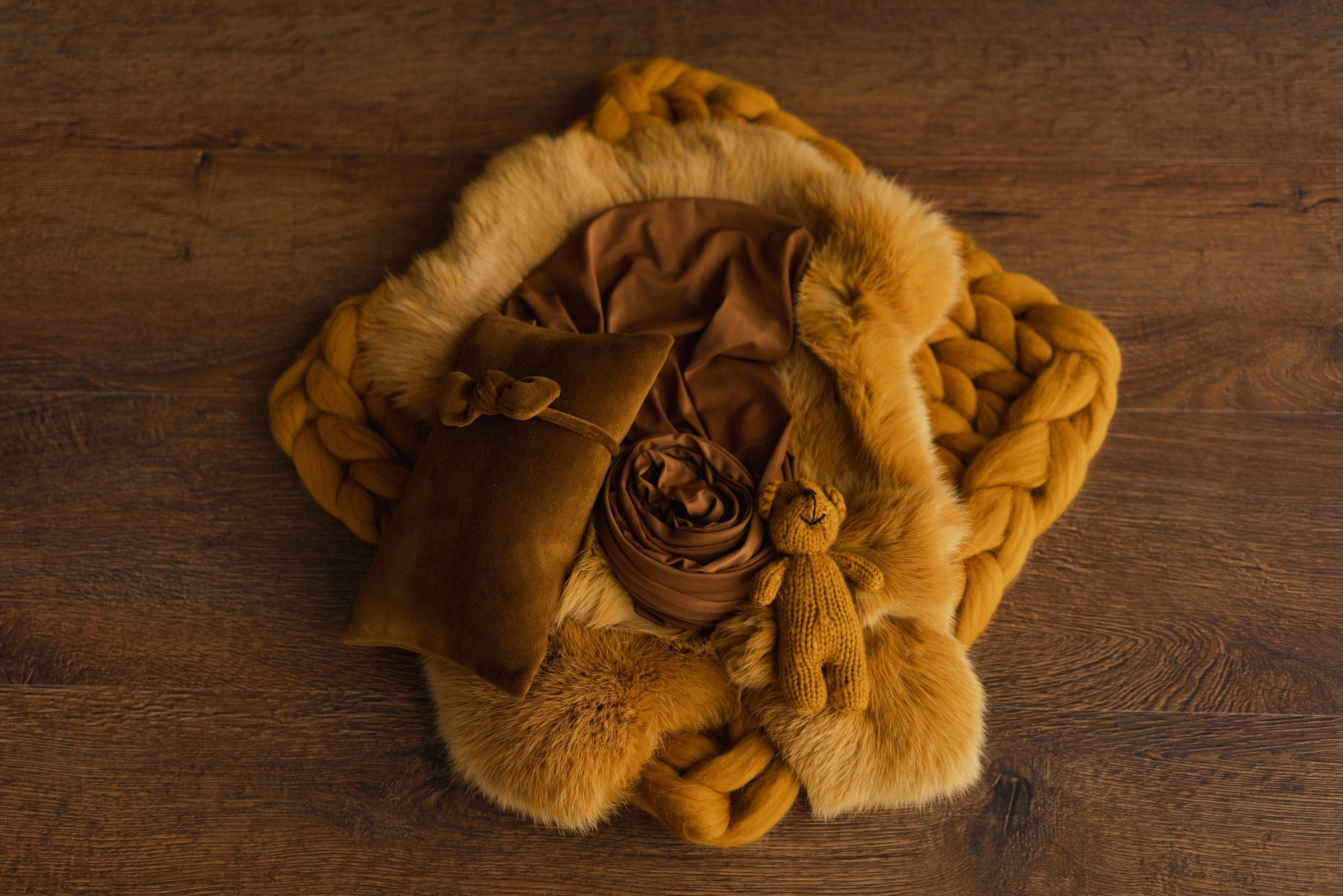 Mustard Newborn Photography Prop Set: Merino Blanket, Wrap, Pillow & Headband, Toy and Natural Fur