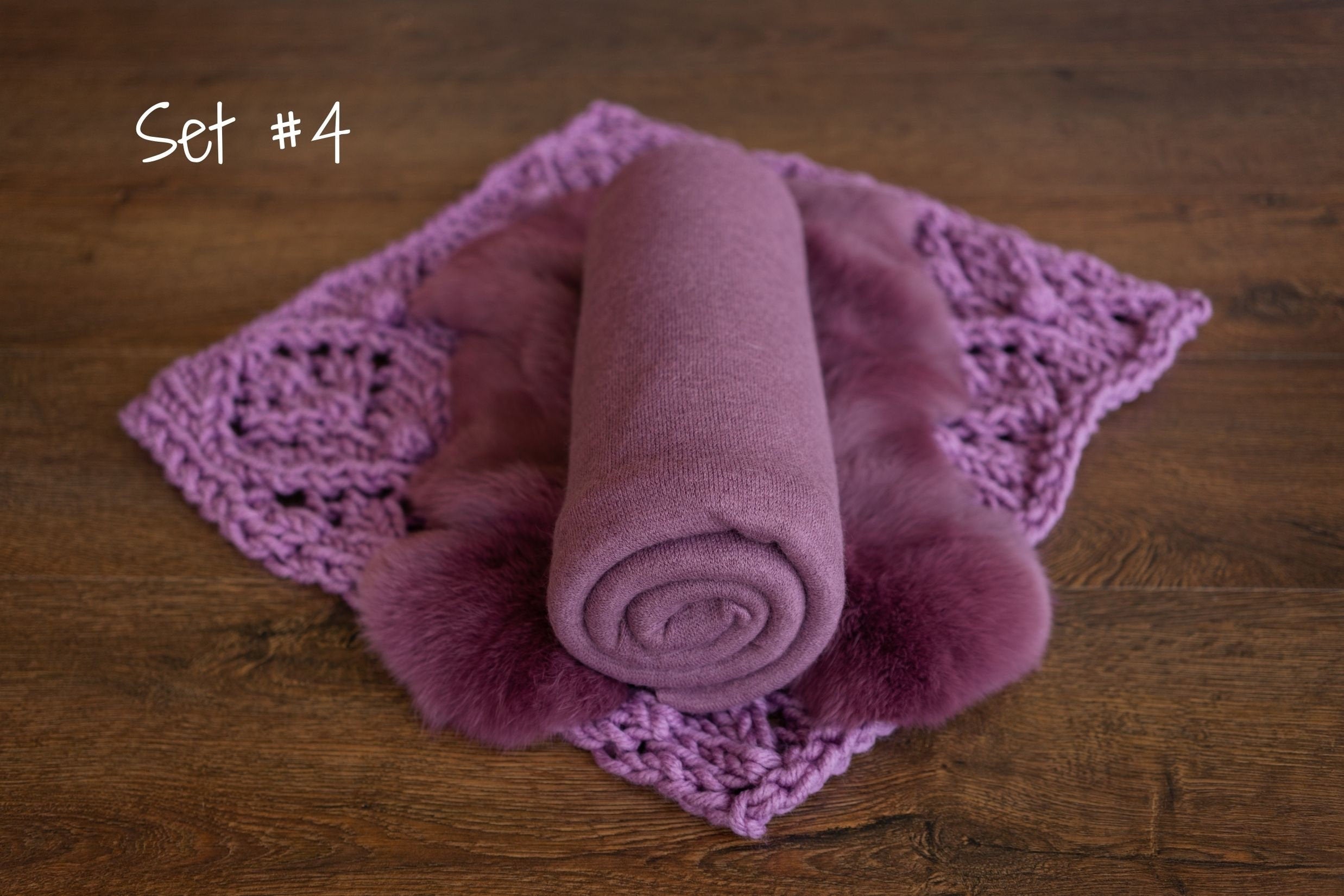 Choose Your Newborn Photo Prop Set Set #1: Newborn knitted blanket, beanbag backdrop, newborn velvet pillow, newborn wrap, natural rabbit fur, and knitted ice-cream toy. Set #2: Newborn knitted blanket, beanbag backdrop, newborn pillow, newborn wrap, and natural rabbit fur. Set #3: Newborn knitted blanket, beanbag backdrop, newborn pillow, and natural rabbit fur. Set #4: Newborn knitted blanket, beanbag backdrop, and natural rabbit fur.