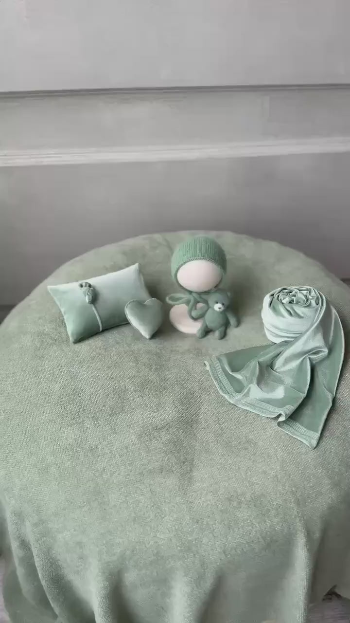 Sage Green Newborn Photography Prop Set: Beanbag Backdrop, Bonnet, Velvet Wrap, Photo Pillow with Headband, and Toys
