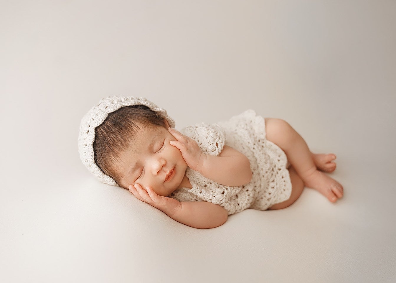 Newborn baby wrapped in a knitted outfit and bonnet on a soft white background