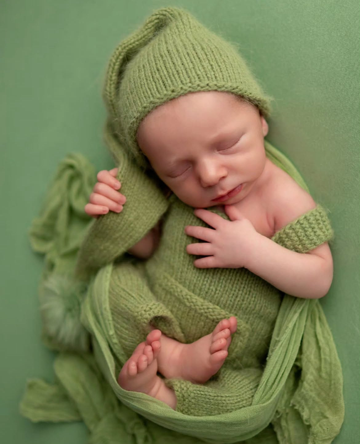 Newborn baby wrapped in a knitted outfit and bonnet on a soft white background