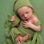 Newborn knit outfit set includes a cozy newborn romper, matching sleep hat with rabbit fur pompom, and a sweet coordinated doll toy, delicately handcrafted from the softest angora wool. The pieces stretch gently for a perfect fit, making this knit newborn prop ideal for timeless newborn photography. This versatile newborn photography prop works beautifully for both boys and girls, offering classic styling and comfort. A charming choice for creating a complete knitted romper set, overalls and bonnet set, or a precious wool baby photo prop set, this baby knitted outfit with toy adds a soft, heartwarming touch to every photoshoot.