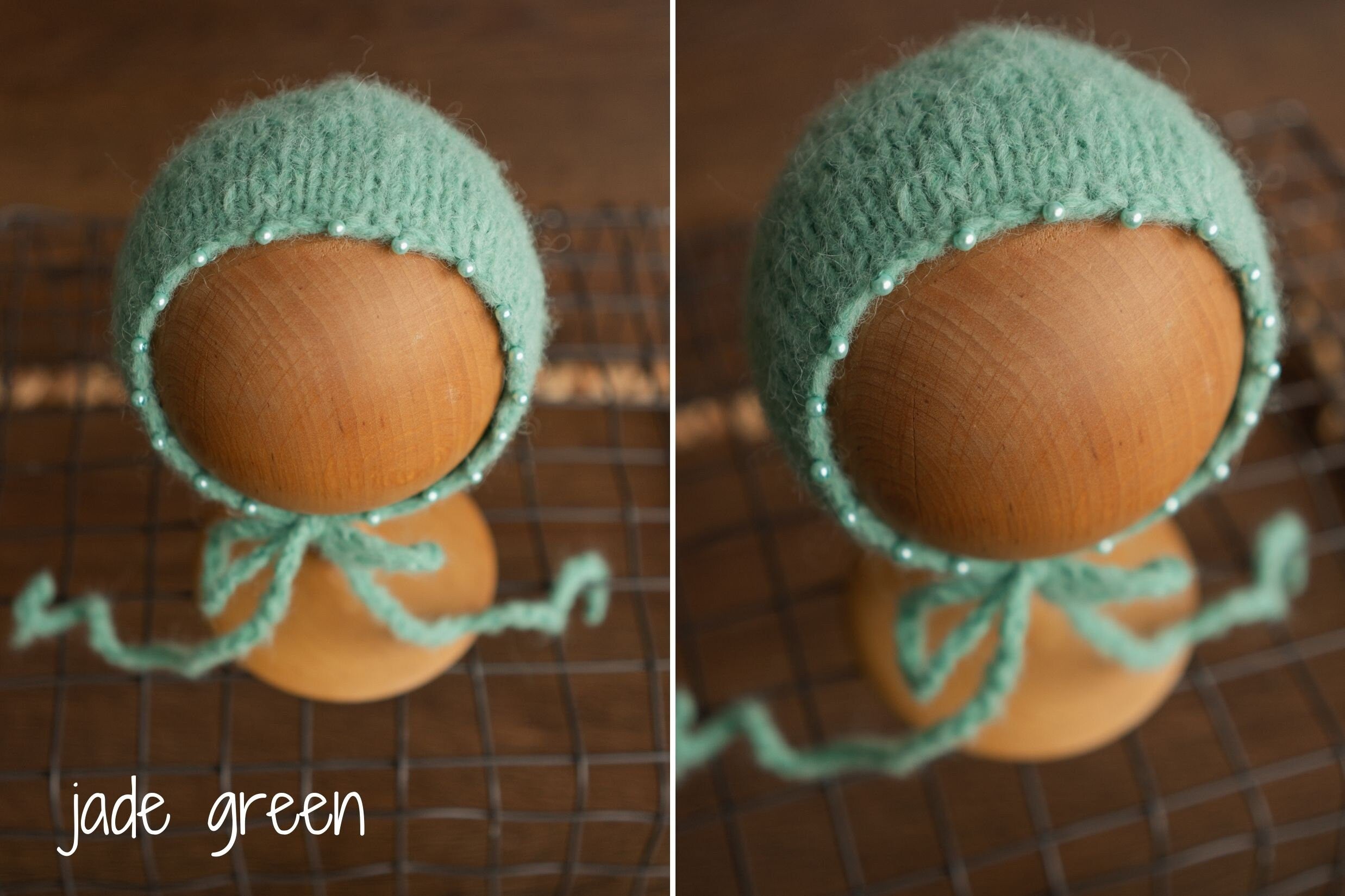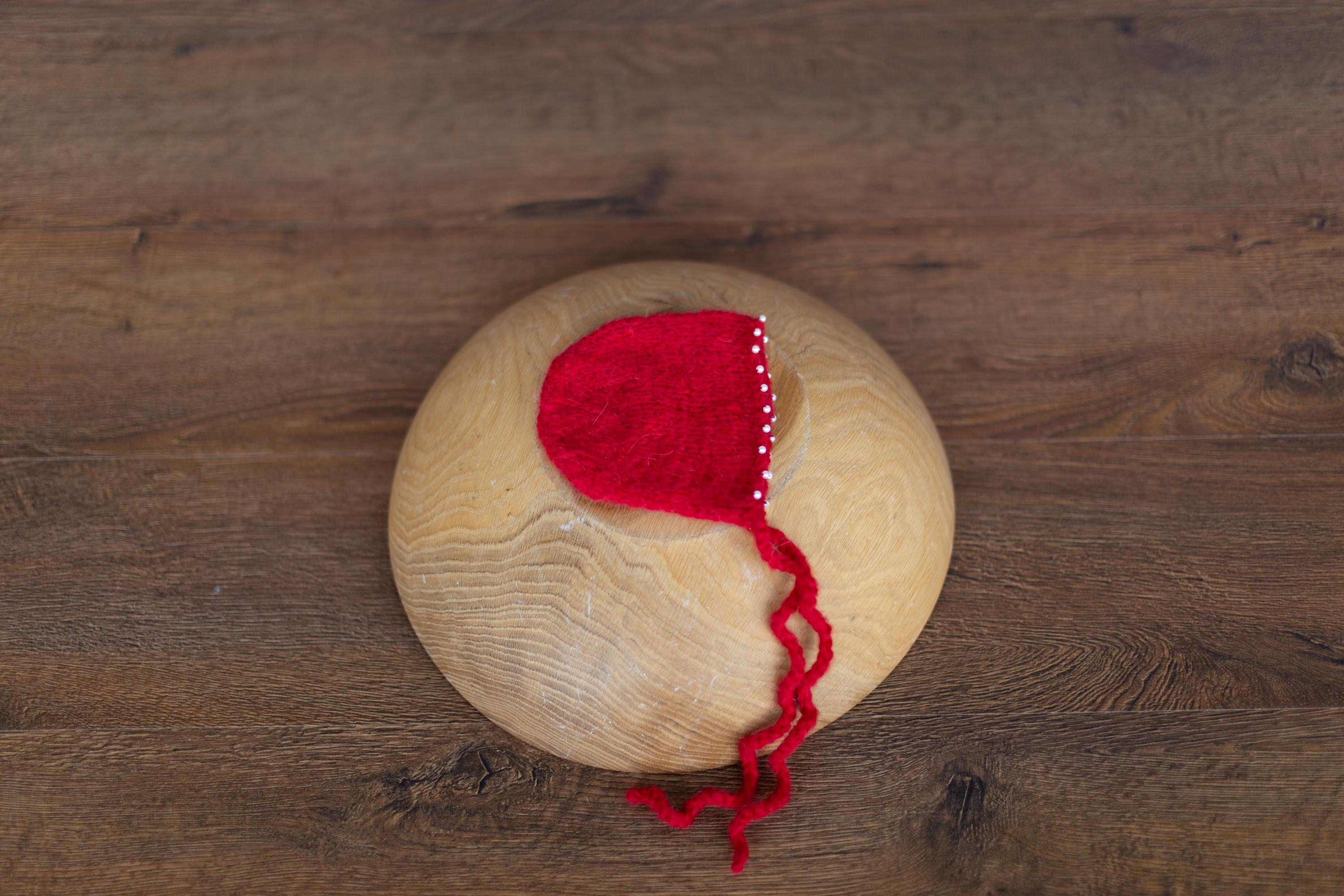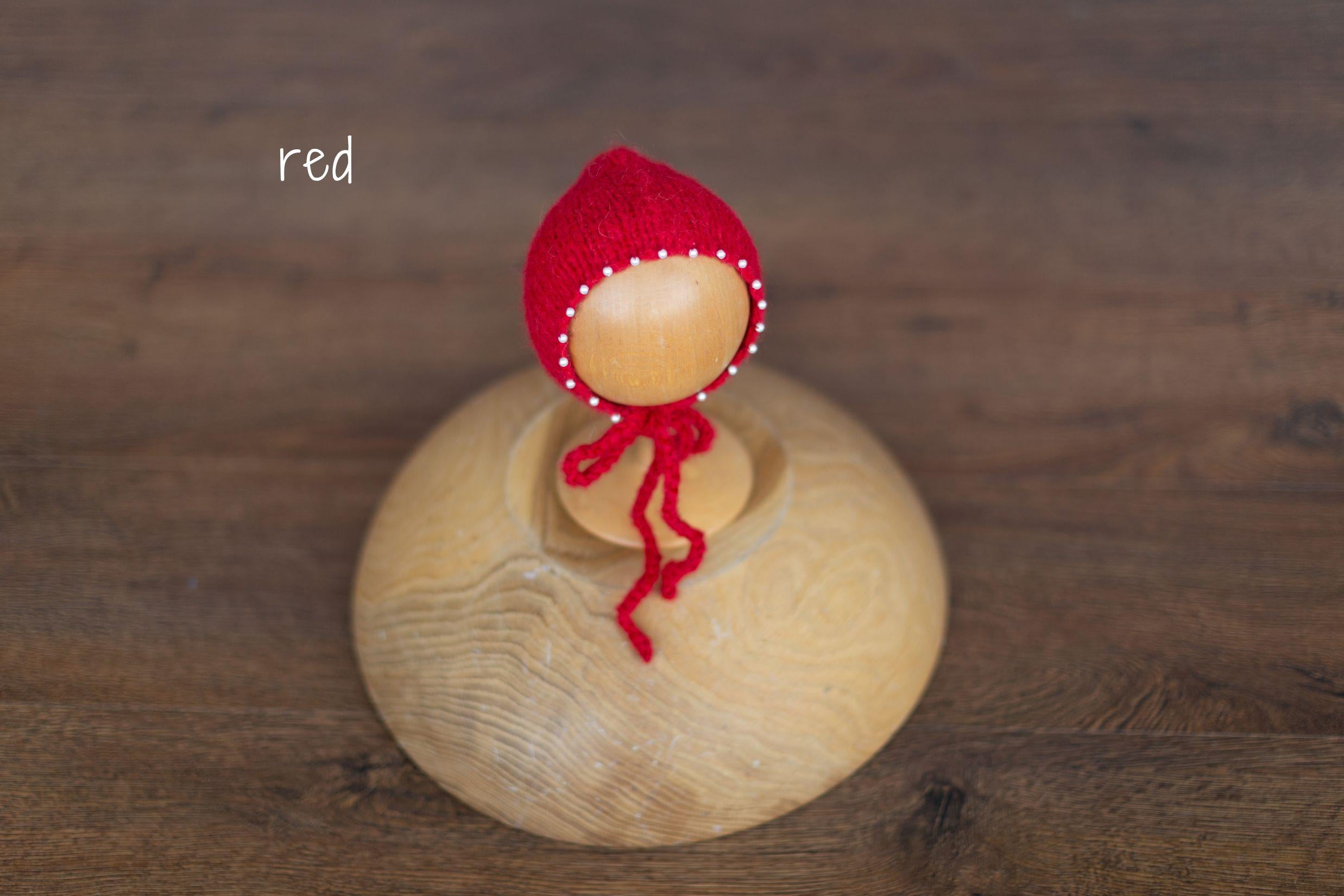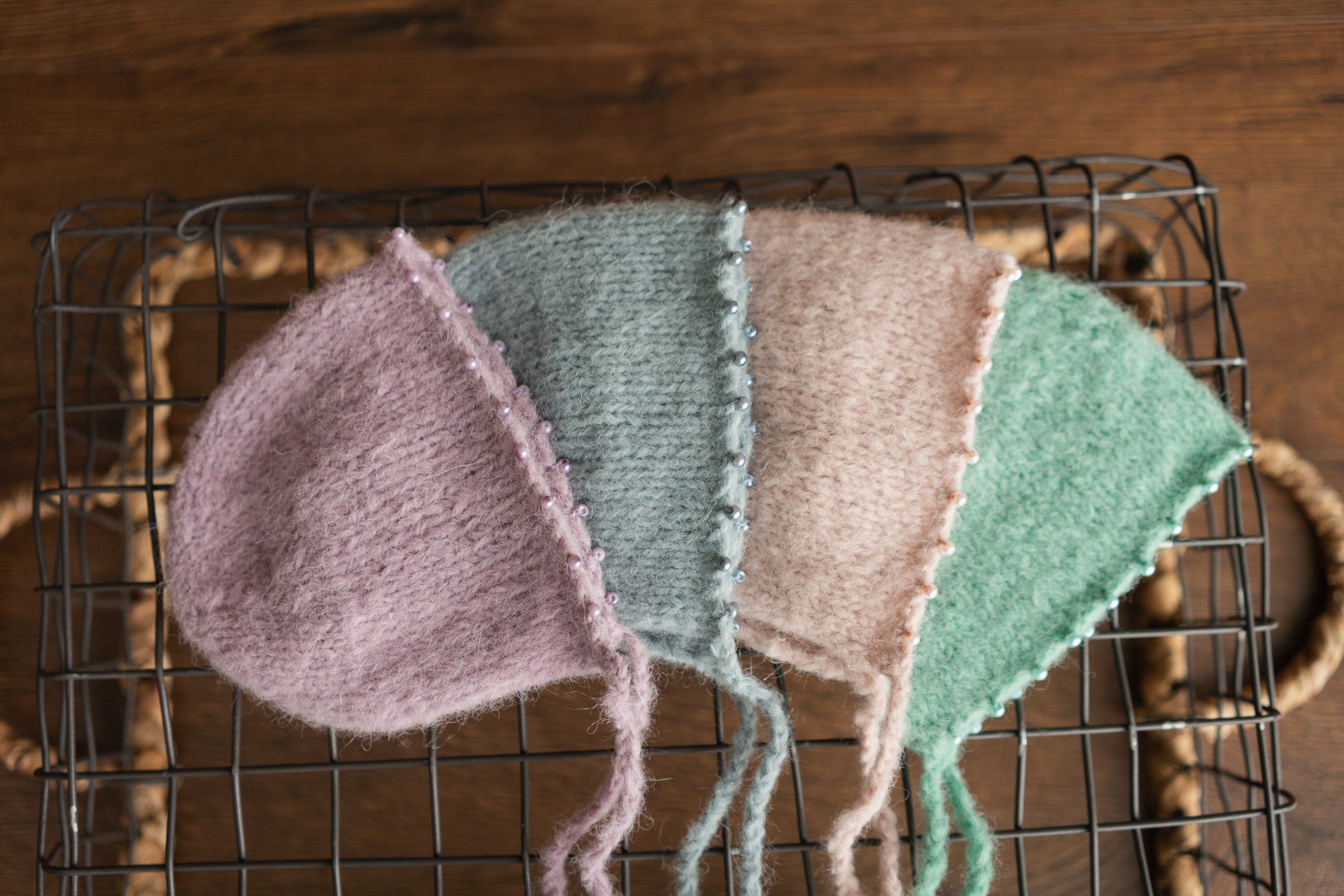 Delicately hand-knitted from the finest soft wool, this baby girl knit pearl bonnet is designed for timeless newborn photography. The newborn bonnet with ribbons and decorative pearls stretches gently for a perfect fit, while pearls add an elegant, dressy touch. Ideal as baby girl knitted photo prop hat, this pearls bonnet beautifully complements classic setups, knit pearl hat props, and any newborn dressy knit bonnet styling.