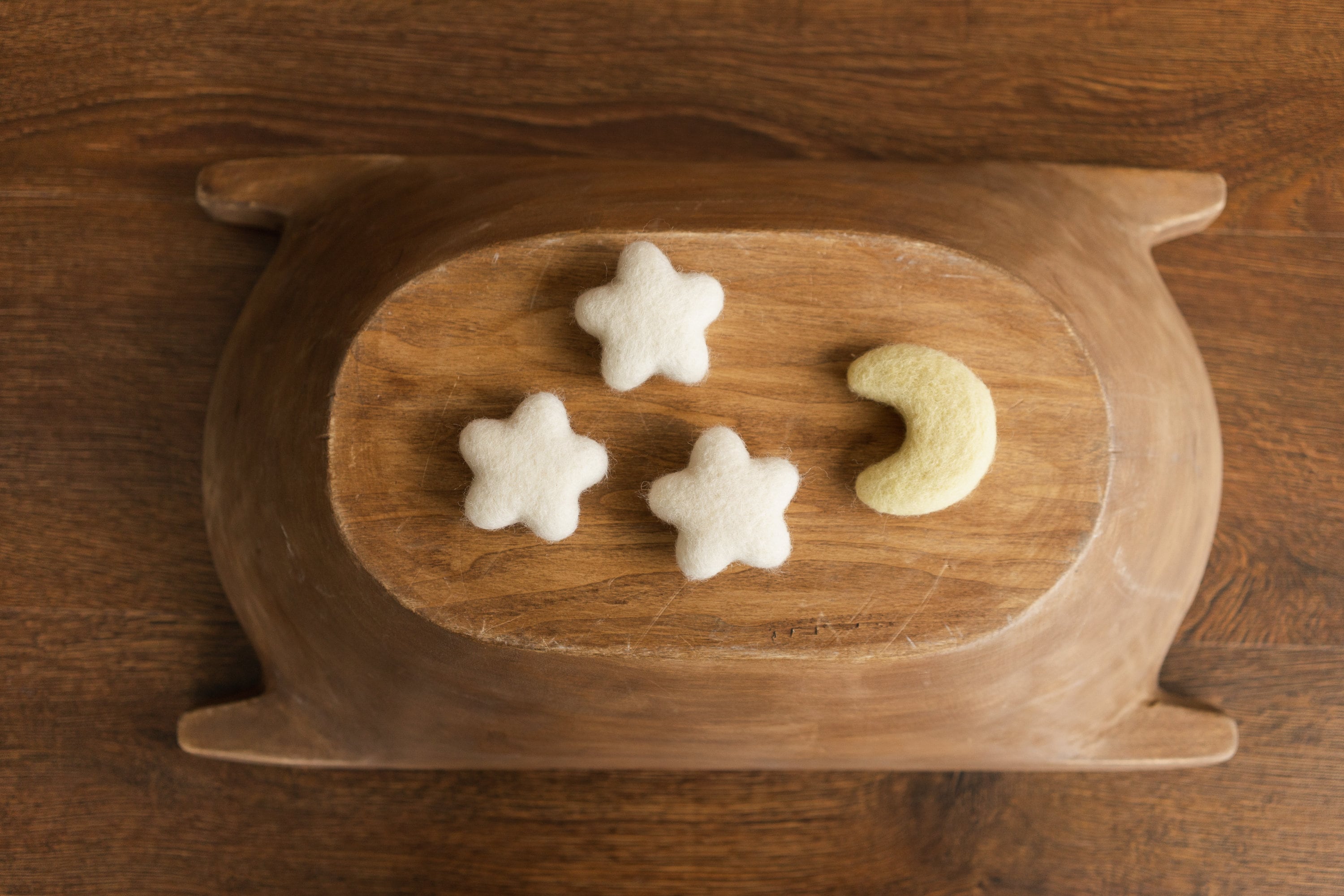 Lovely newborn felted moon and stars set with a soft felted rainbow and fluffy felt clouds is a charming addition to any newborn photography prop collection. Each newborn felt prop is handcrafted with love using the delicate needle-felting technique, creating beautifully textured pieces that bring warmth and tenderness to baby photoshoots.
