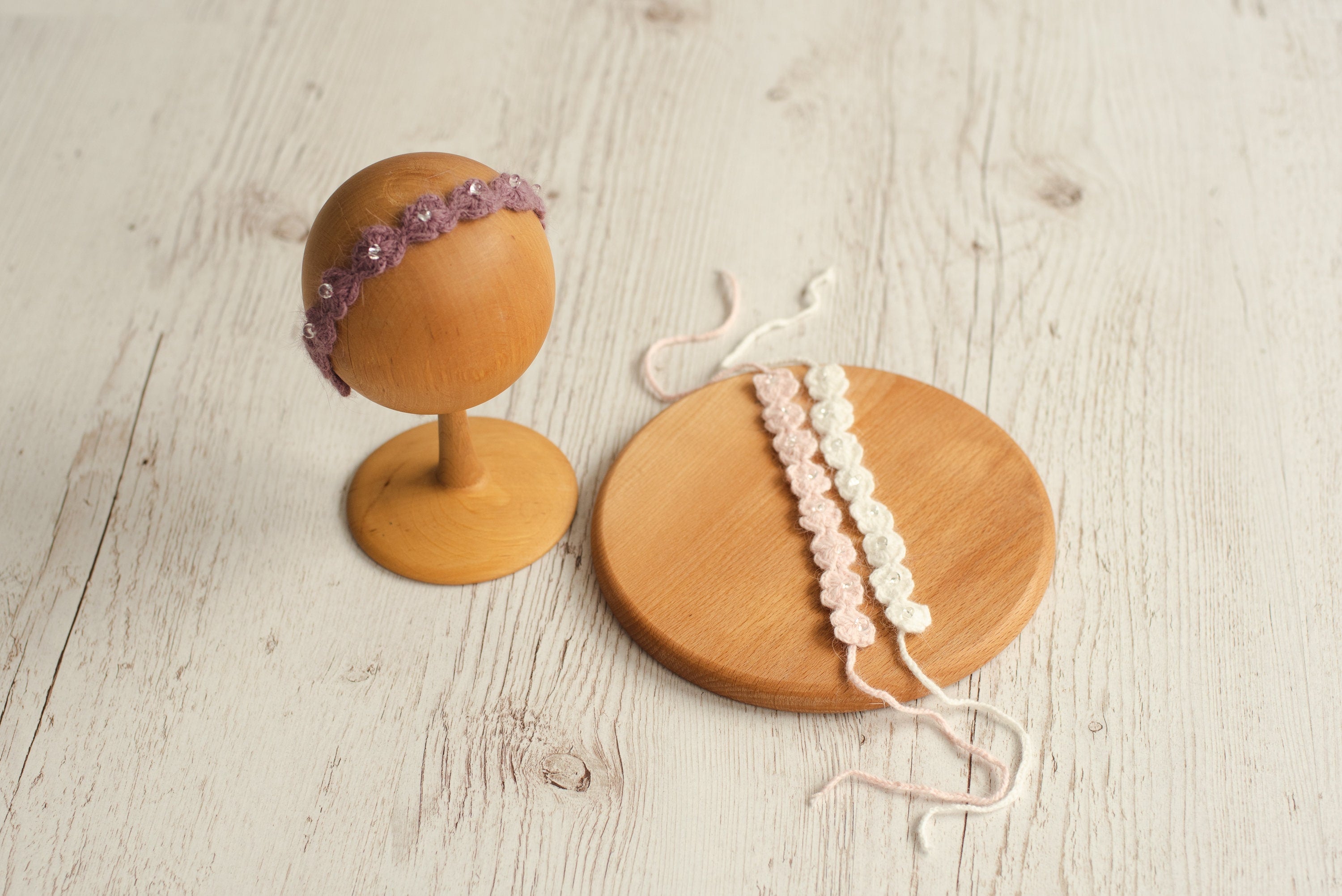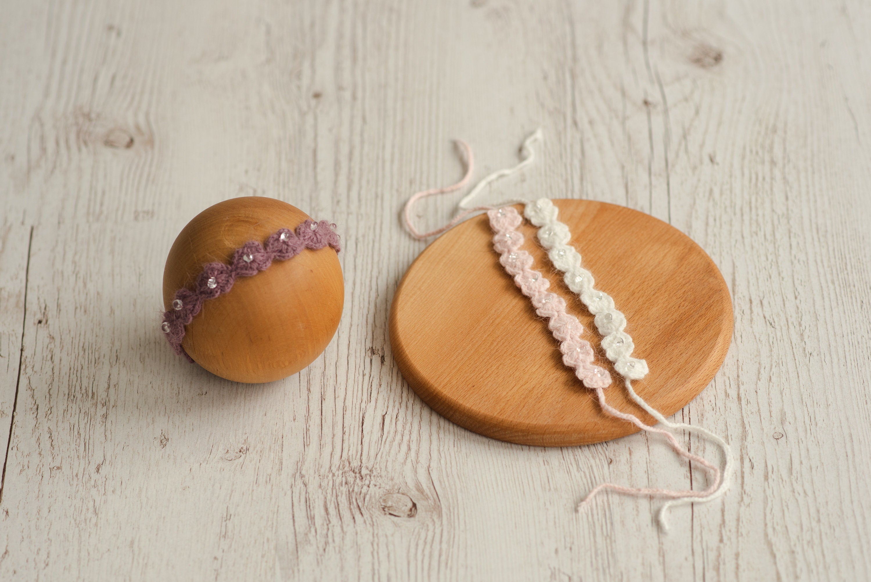 Delicate and charming, our hand-knitted newborn bow headbands for girls are crafted from soft angora wool and accented with beads. Perfect for newborn photos, these headbands pair beautifully with all our knitted items made from the same angora wool yarn. Also features a subtle crochet flower headband design, adding a whimsical, photo-ready touch to any newborn outfit.