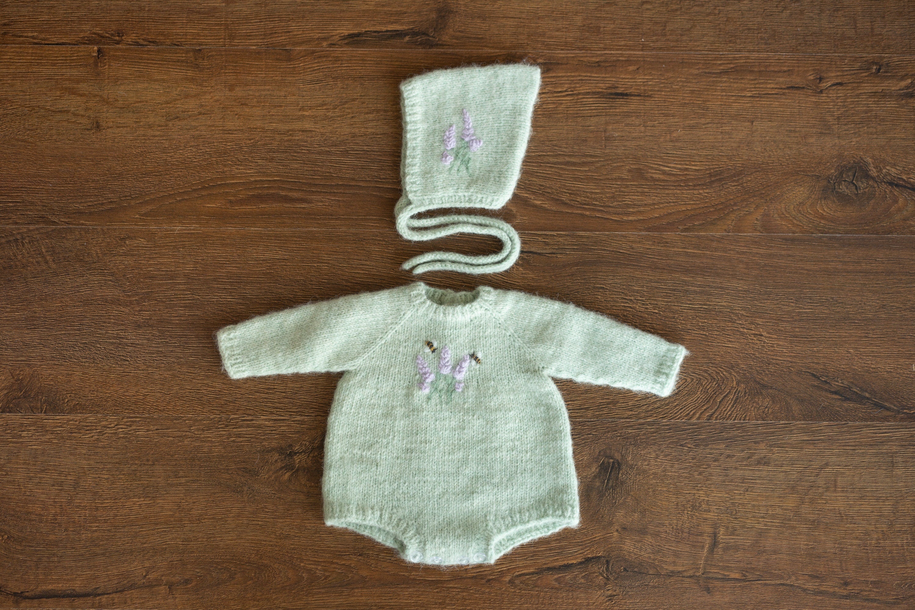 Newborn Knitted Bonnet with Embroidered Lavender Flowers