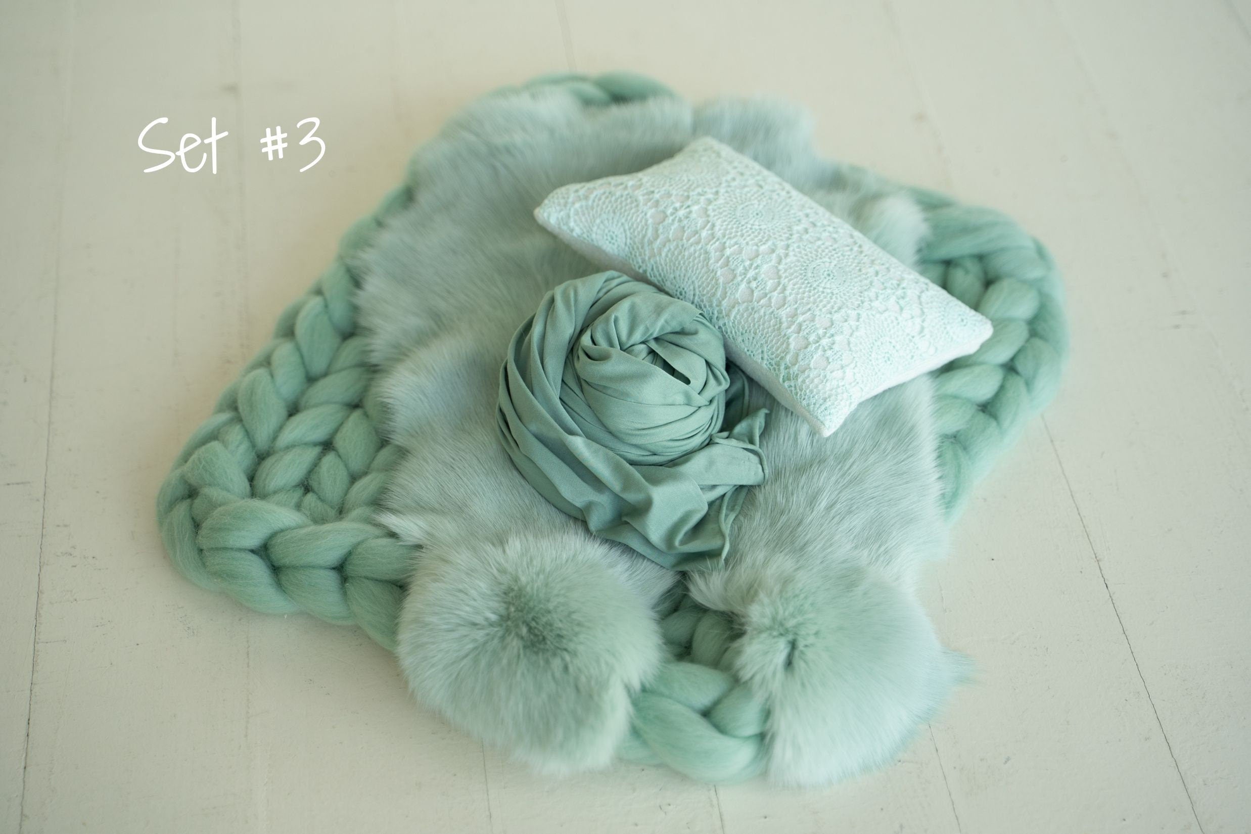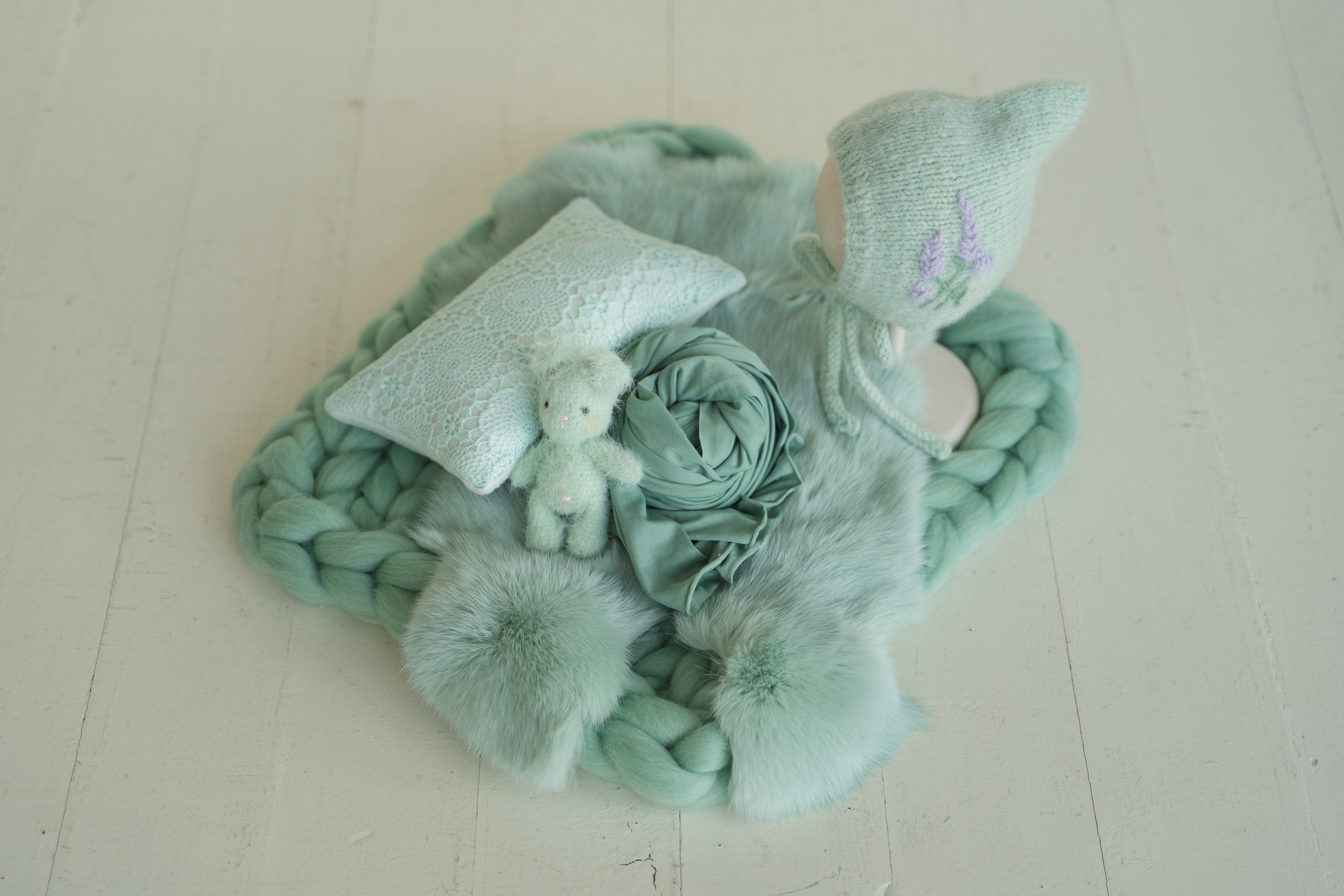 Mint Green Newborn Photography Props Set: Merino Blanket, Wrap, Fur, Photo Pillow, Bonnet & Toy