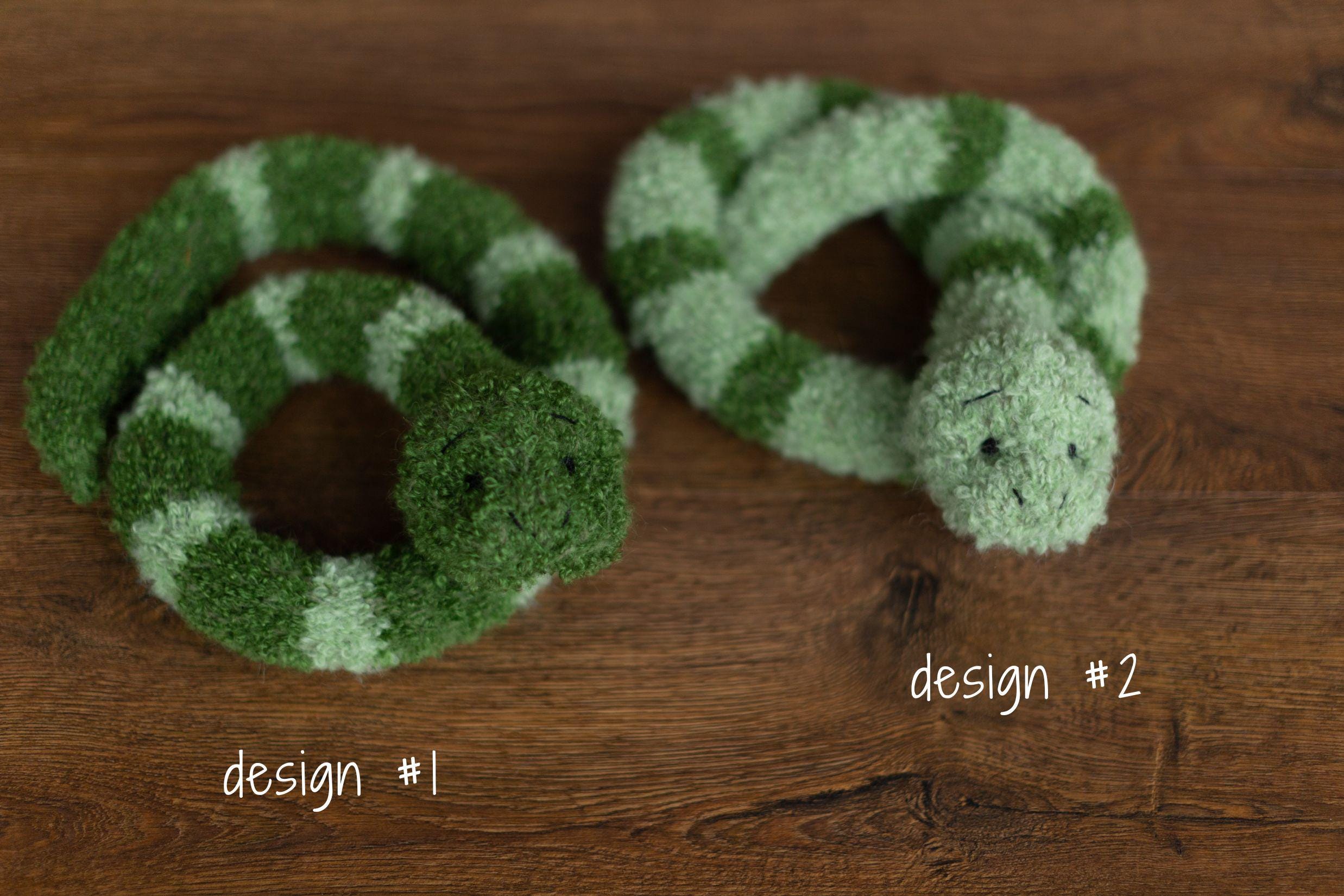 Long green hand-knitted snake toy are perfect as newborn photography props, baby toys, or keepsakes. Crafted from soft boucle yarn, each snake toy baby brings warmth and texture to newborn photoshoots, adding a touch of playful charm.