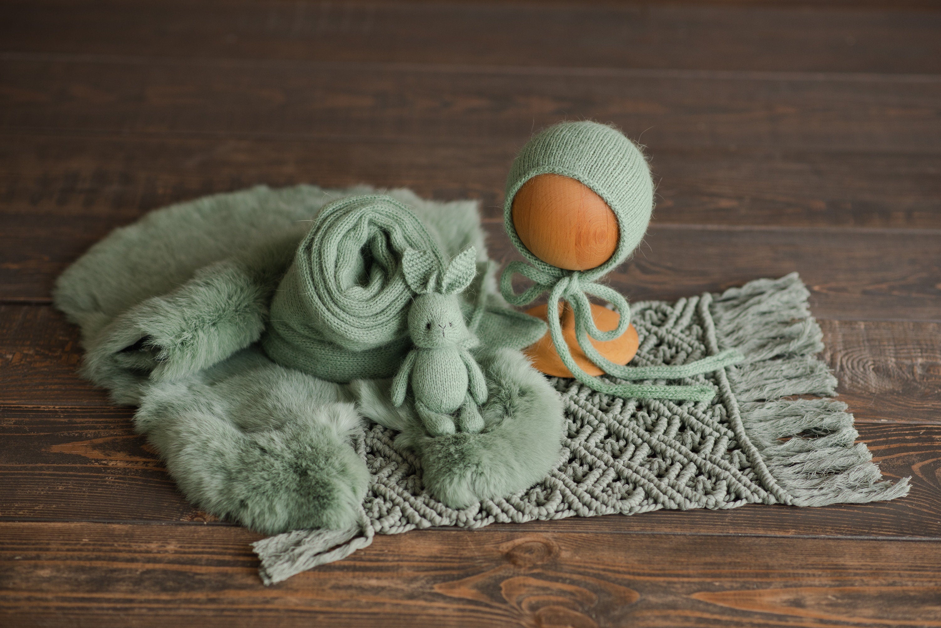 This beautiful sage newborn photoshoot set is the perfect combination for cozy and professional newborn photography sessions. The full set includes a soft macrame rug, natural rabbit fur, delicate newborn knitted wrap and bonnet, a charming knitted bunny toy, and a cute knitted heart toy — everything you need for stunning baby portraits in dusty green tones.