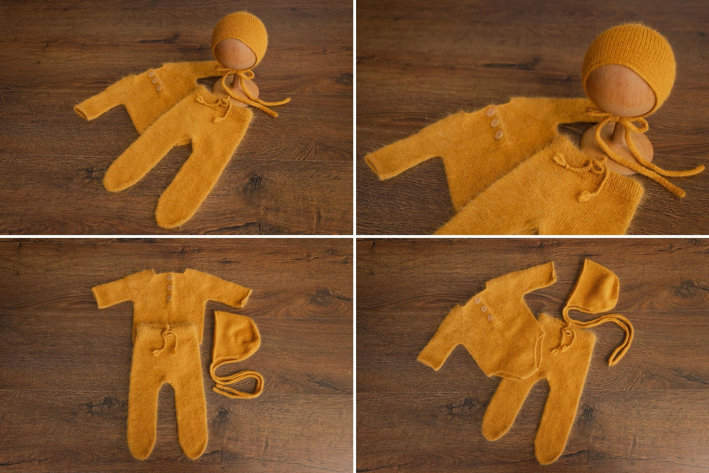 Beautifully handcrafted from the finest angora wool, this newborn knitted outfit set combines elegance, comfort, and timeless style for newborn photoshoots. The set includes a soft knitted romper, matching sleep hat, and cozy newborn tights, perfect as a newborn photography prop.