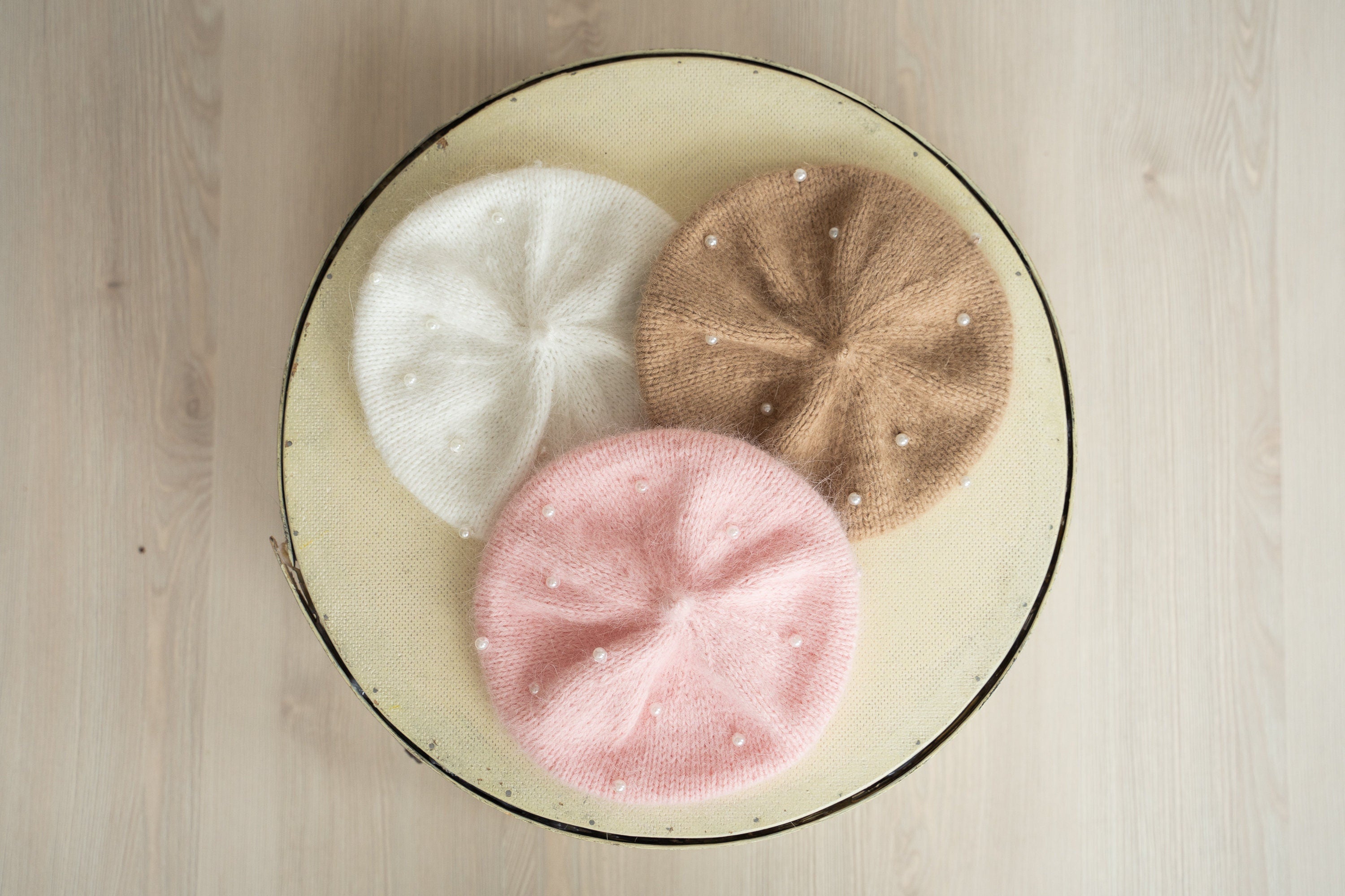 Baby knit beret with beads is perfect for newborn and toddler photoshoots or as a charming accessory, exquisitely handcrafted from the softest angora wool. The delicate pearl bead detailing makes this newborn knitted beaded hat elegant and timeless. Ideal as a knitted newborn beret hat for photoshoot or newborn photo prop beret, it offers gentle stretch, a comfortable fit, and a stylish, heirloom-quality look for your little one.