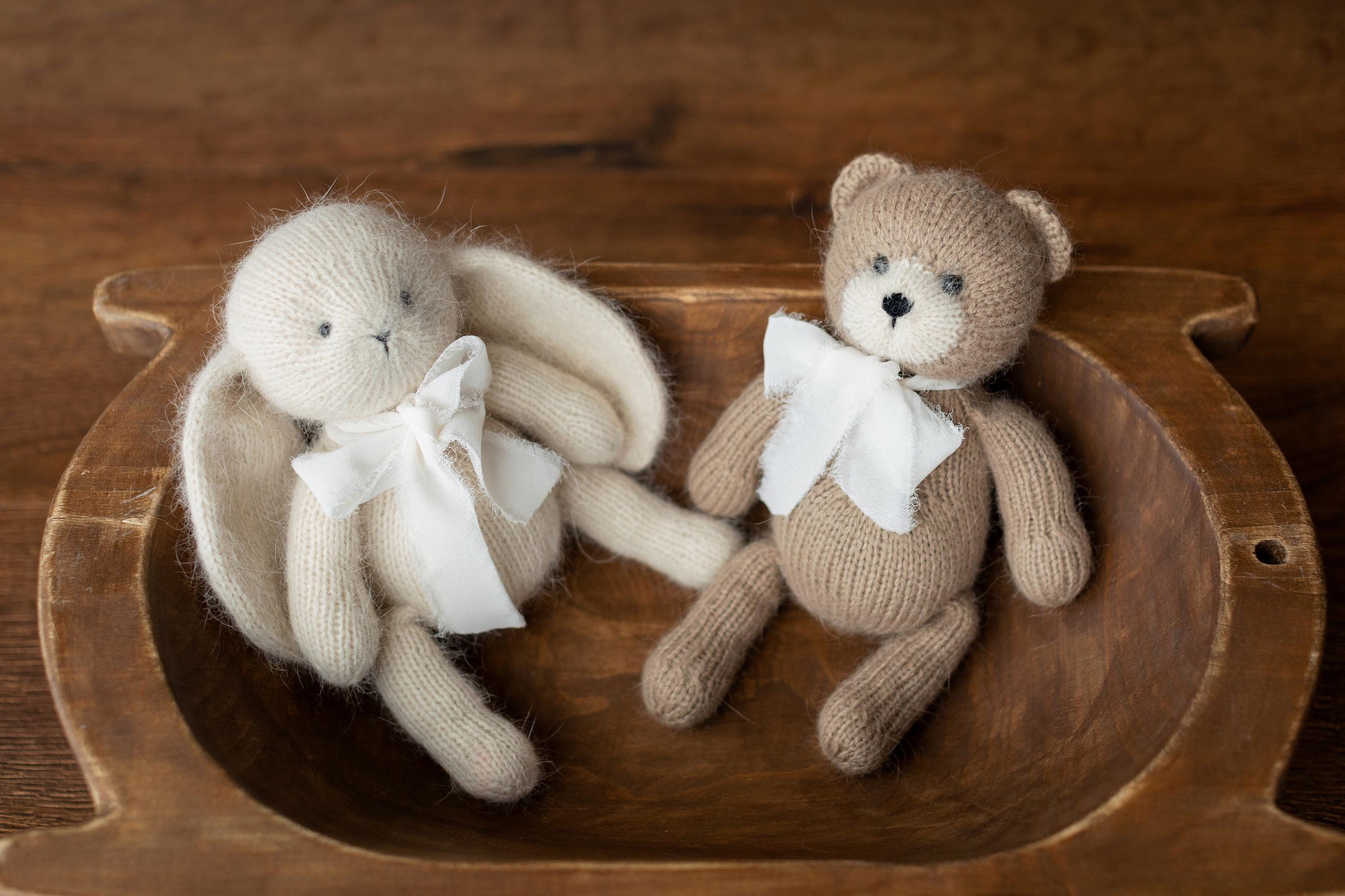 Lovingly hand-knitted from soft angora wool, these teddy bears and bunnies add warmth and charm to newborn photography sessions. Their pastel tones blend effortlessly with other props, creating soft, timeless compositions.