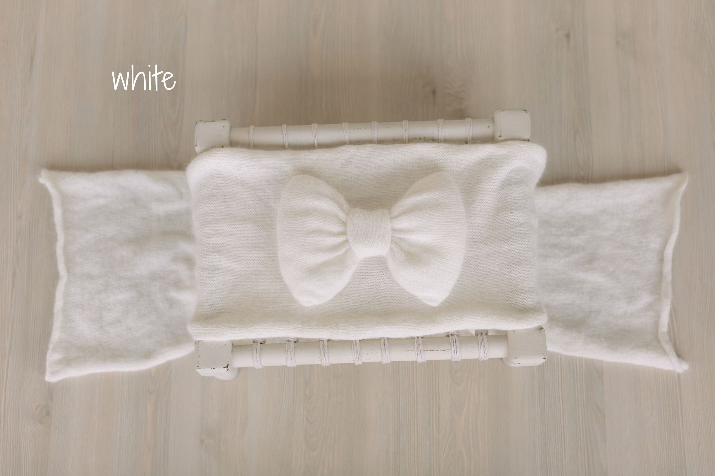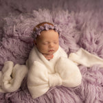 This hand-knitted wool bow pin is a charming accessory for newborn photography, adding a delicate touch to knitted wraps and baby girl outfits. Versatile and stylish, it pairs beautifully with our Angora Wool Knitted Props Collection, crafted from the same soft yarn for a perfectly matched, timeless look in every photo.