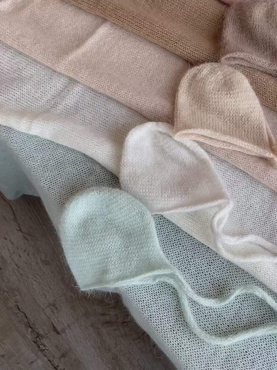 Beautiful and delicate, this knitted newborn wrap with matching bonnet is made from the softest angora wool. Stretchy, fluffy, and lightweight, it feels gentle on a baby’s skin and is ideal for professional newborn photography.