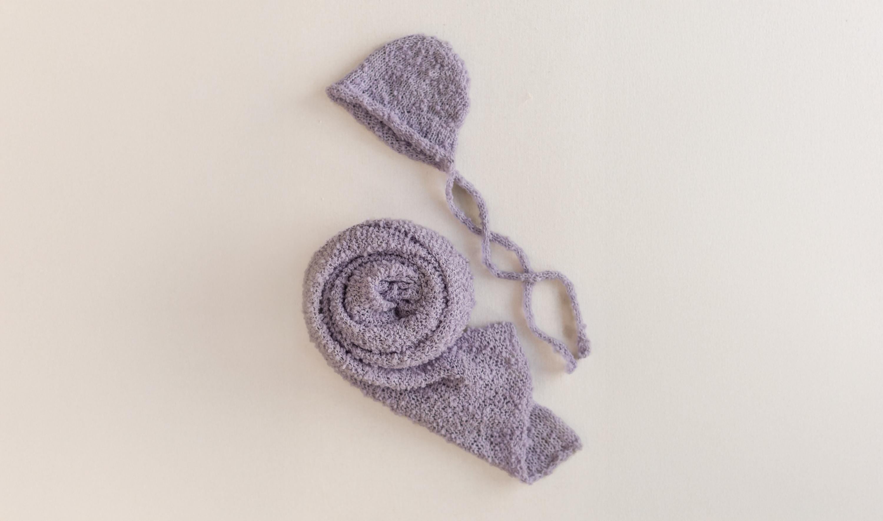 Newborn knit bonnet and knit wrap are exquisitely soft and delicately hand-knitted from premium boucle yarn. Gently stretchy and lightweight, they provide a perfect fit and cozy feel for the baby. Ideal as newborn photo props, these pieces add a beautiful, textured touch to your photography sessions, creating timeless and dreamy newborn portraits.