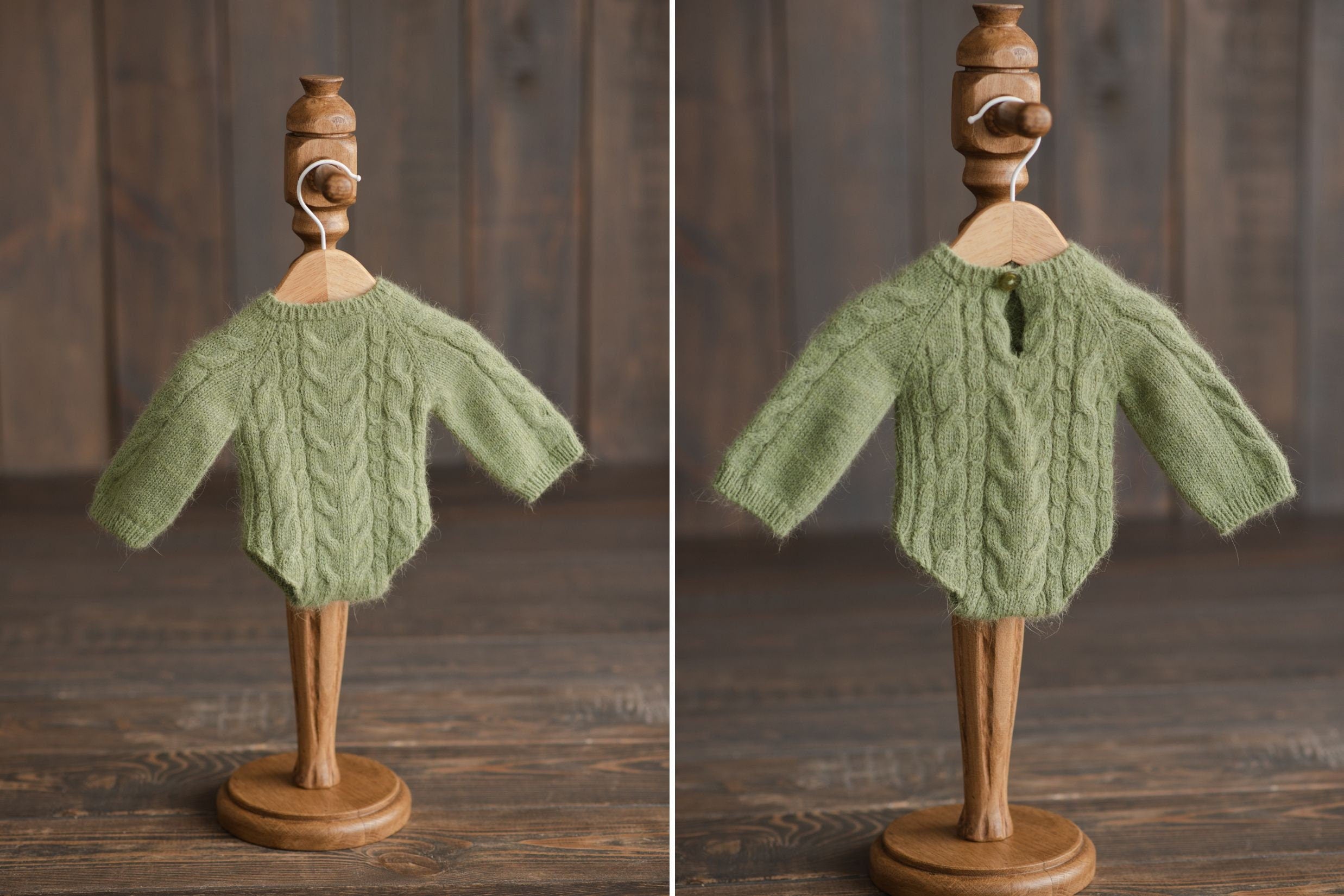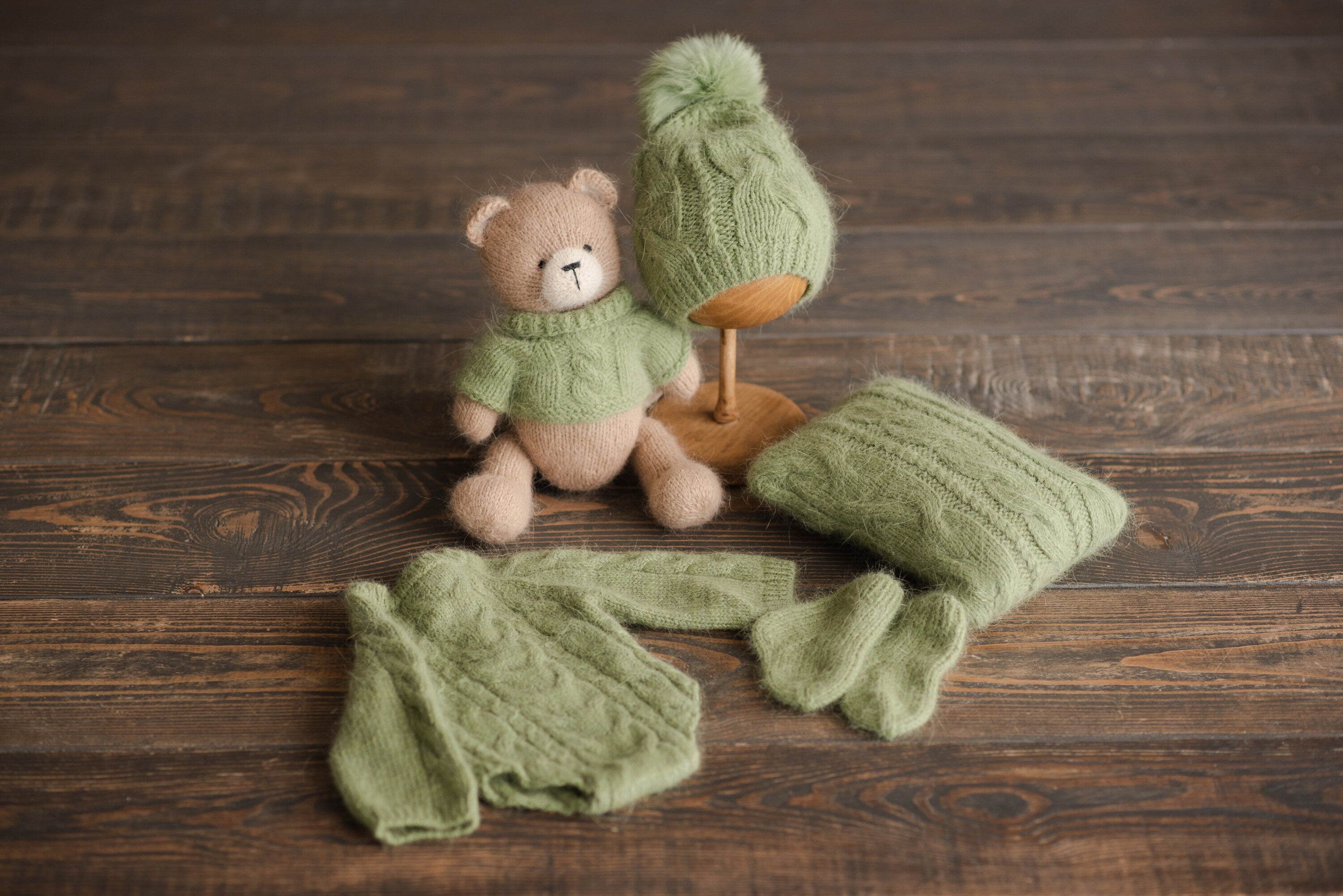 This cozy newborn knit outfit is perfect for timeless and memorable newborn photoshoots. Handmade from soft angora wool using a classic cable design, this knit newborn outfit stretches gently for comfort and style. Designed as a unisex newborn march knit set, it includes a long sleeve newborn romper and a matching newborn knitted hat, making it an ideal hand knitted newborn clothing choice for keepsake portraits. The set can also come with a coordinating newborn pillow and newborn socks, creating a complete 4 piece knit set perfect for any newborn shooting outfit.