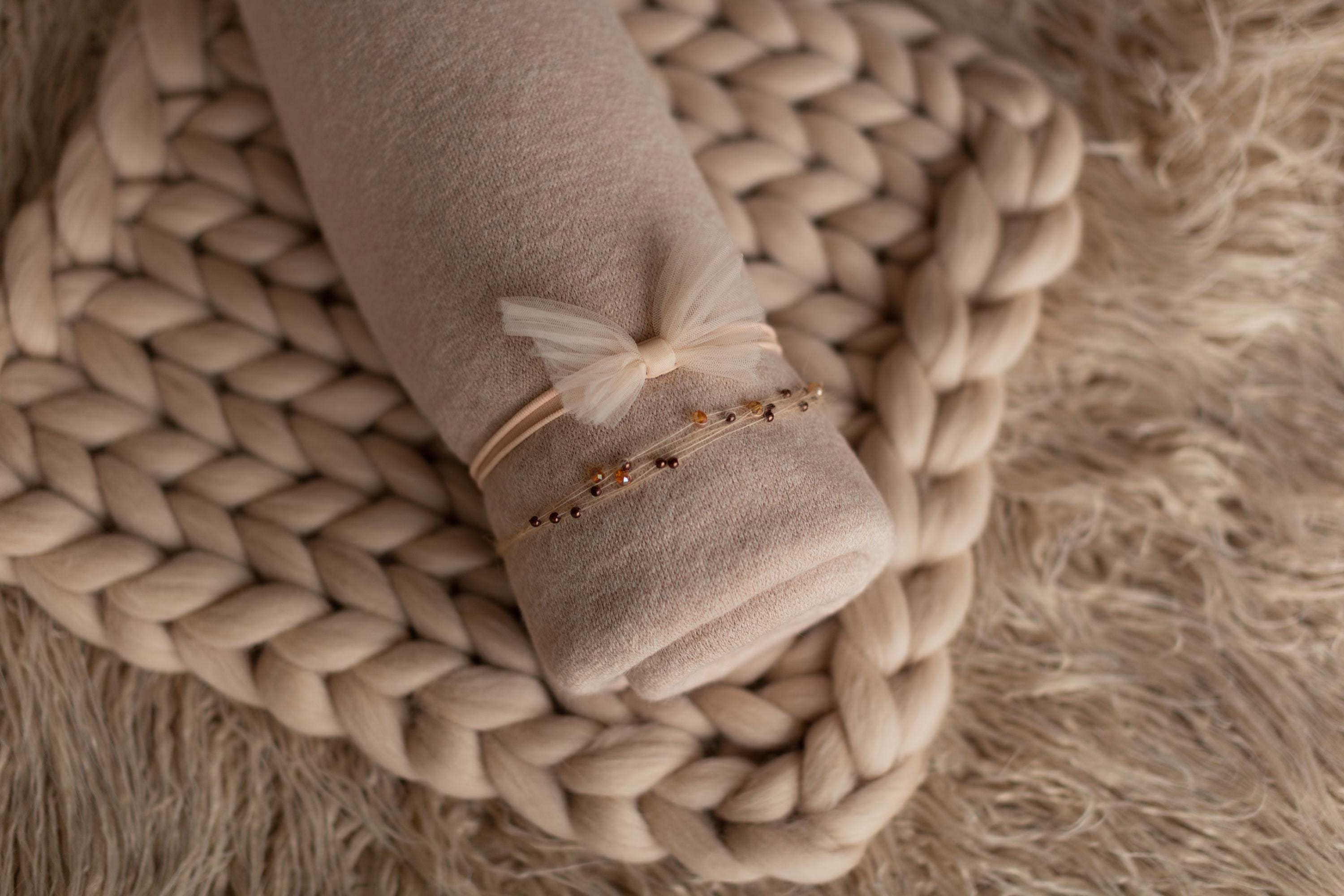 This beautiful beige newborn photoshoot prop set is the perfect combination for cozy and professional newborn photography sessions. The set includes a soft flokati faux fur, beanbag backdrop, delicate merino wool blanket, and a pair of matching newborn headbands — everything you need to create warm and timeless baby portraits.