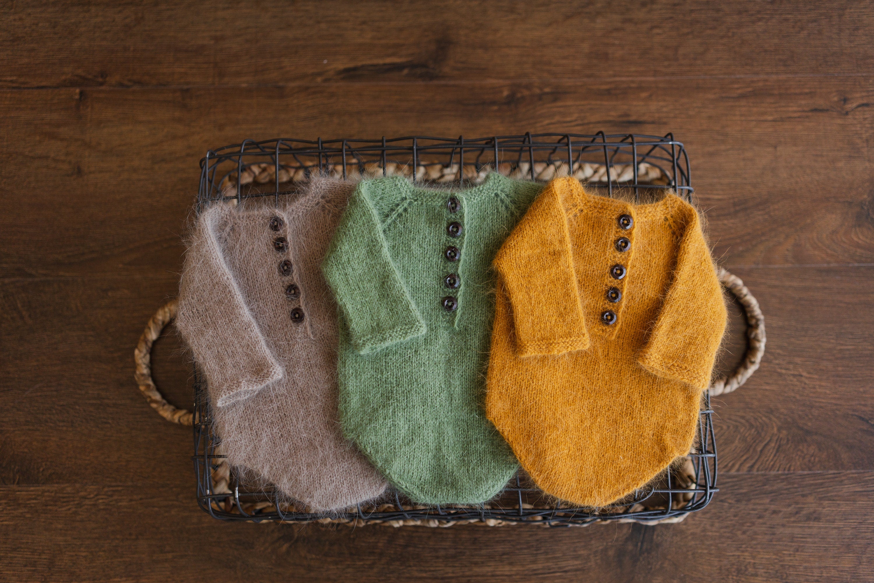 Handcrafted from ultra-soft angora wool, this newborn photography outfit offers gentle stretch, comfort, and timeless style. Designed as a reversible newborn knitted outfit, it can be worn on either side — with a button-front look or a plain classic front — making it beautifully versatile for newborn photos or a coming-home outfit. Available in soothing tones, these neutral newborn clothes suit both boys and girls, making the solid knitted romper an ideal gift for new parents.