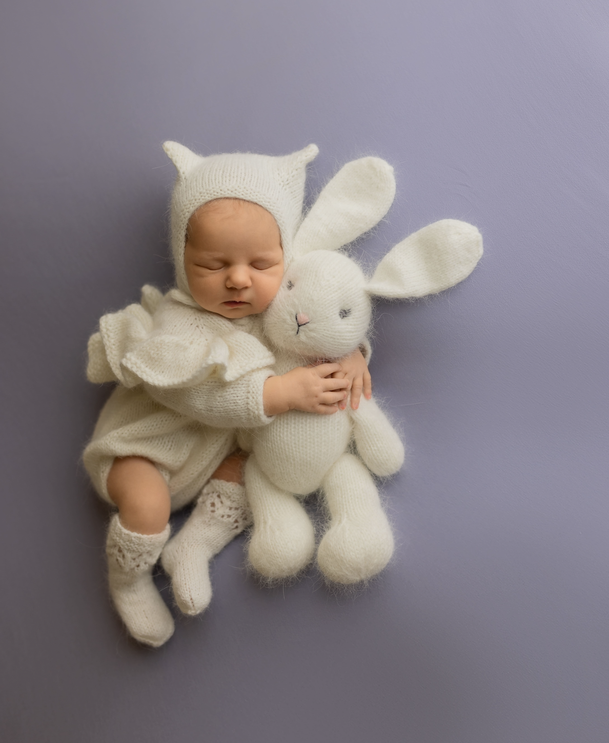 Newborn baby wrapped in a knitted outfit and bonnet on a soft white background