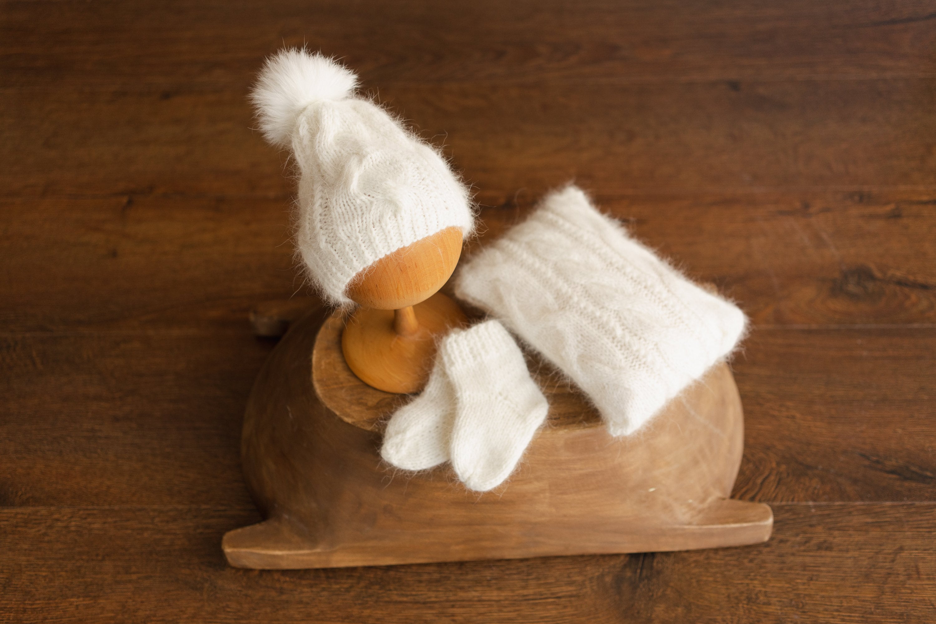 Angora Wool Newborn Cable Knit Hat with Pom Pom, Socks & Matching Photo Pillow