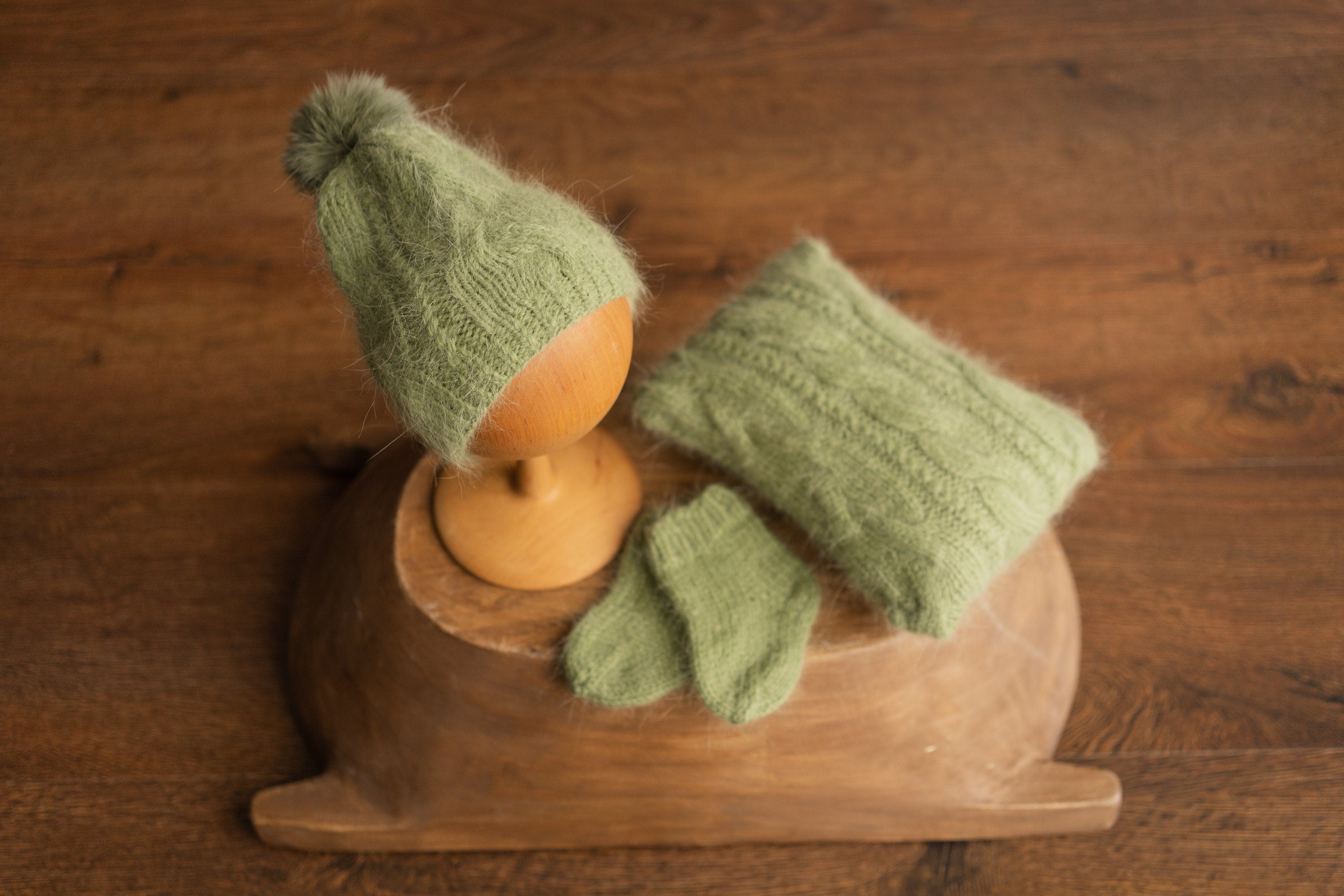 The set also includes a matching photo pillow for beautifully coordinated setups, with an option to add newborn knitted hat with pom socks for a complete look. A perfect choice for creating warm, elegant, and natural newborn photos.