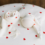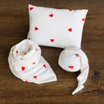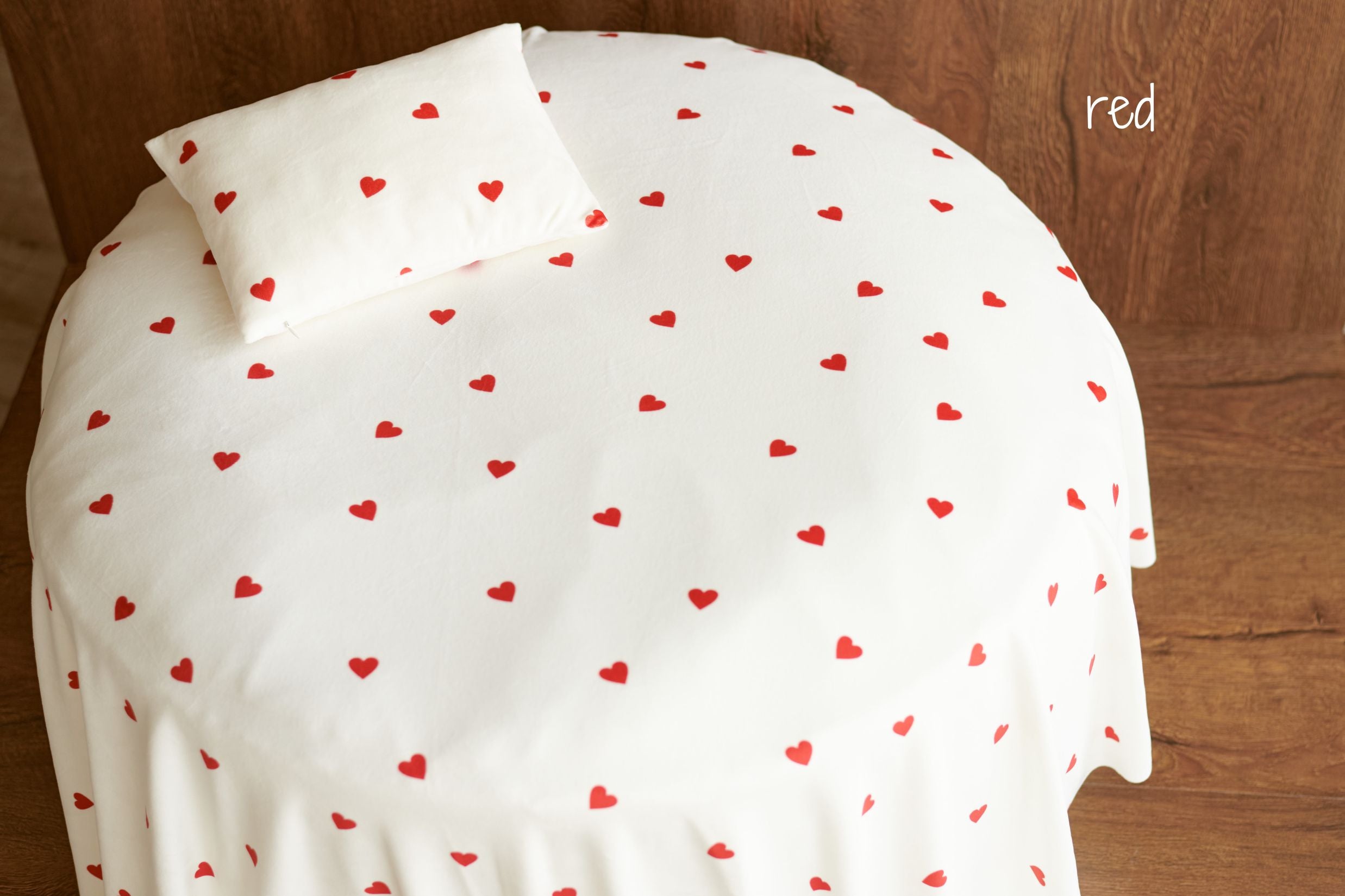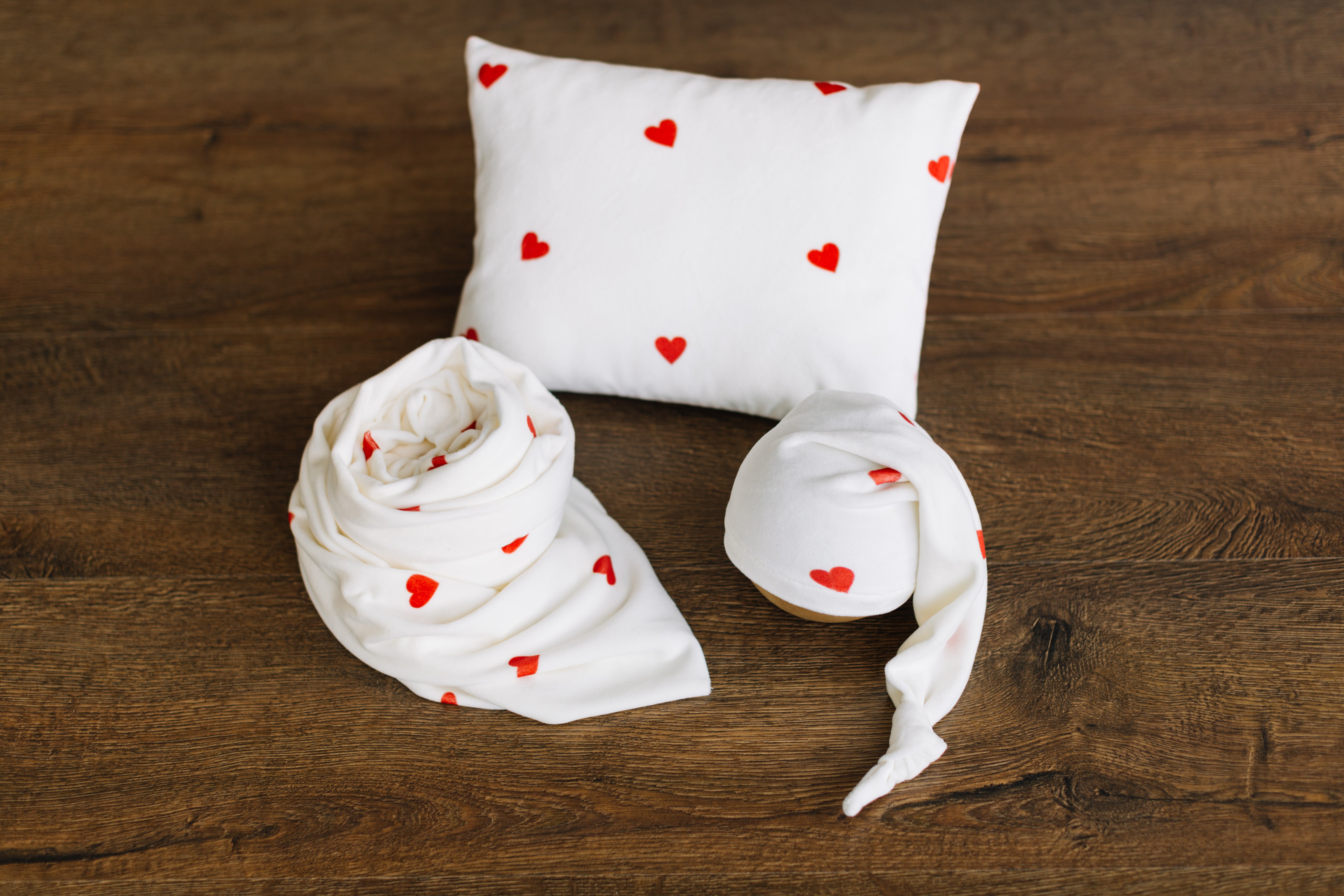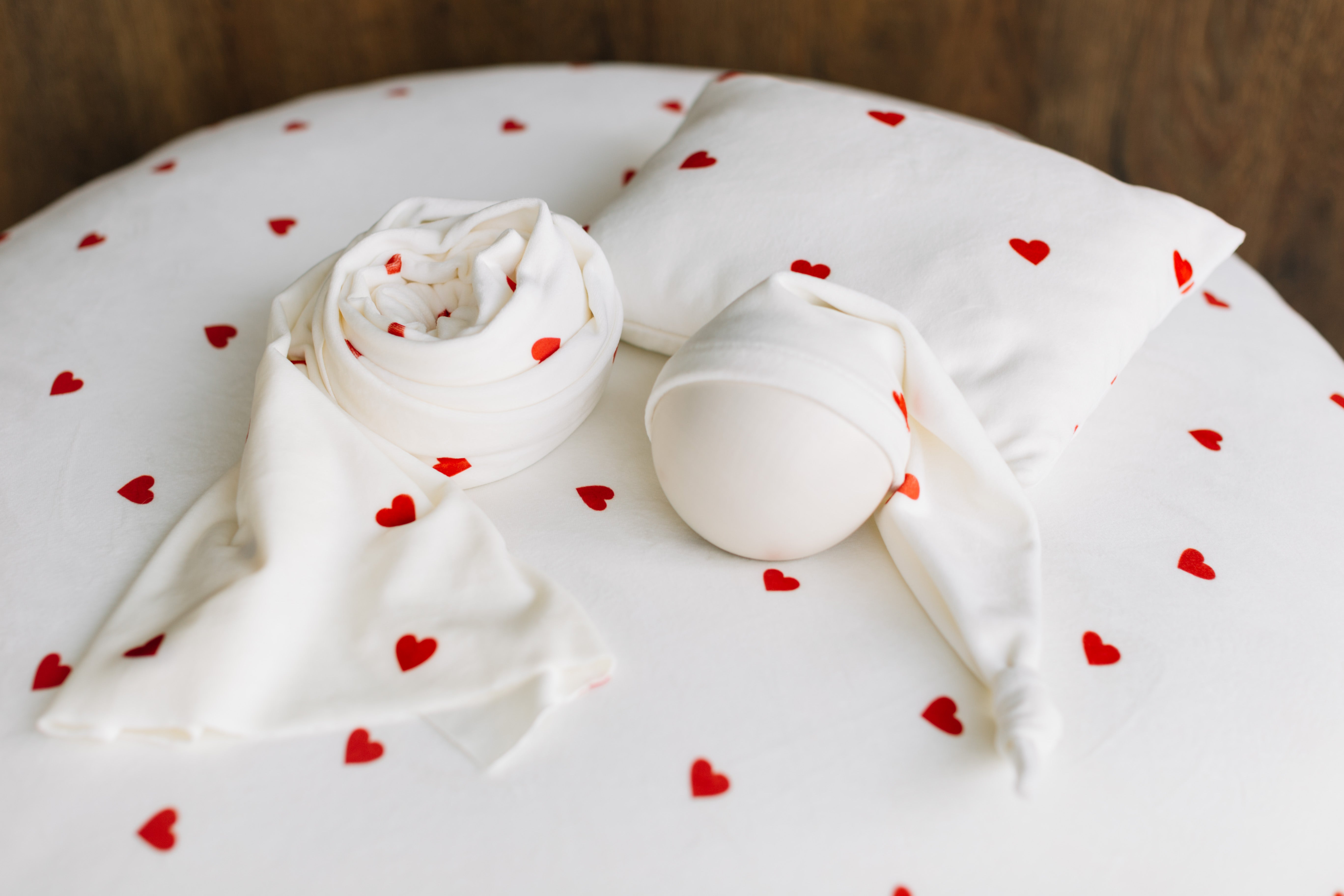 Valentine’s Day Newborn Photography Props Set with Hearts – Fabric Backdrop, Pillow, Layers, Sleep Hat